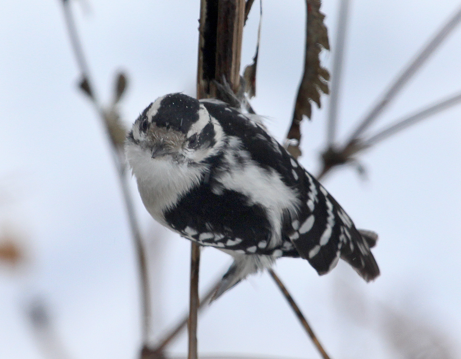 A female Downy Woodpecker perches next to a birdfeeder in New England, Jan. 2015.