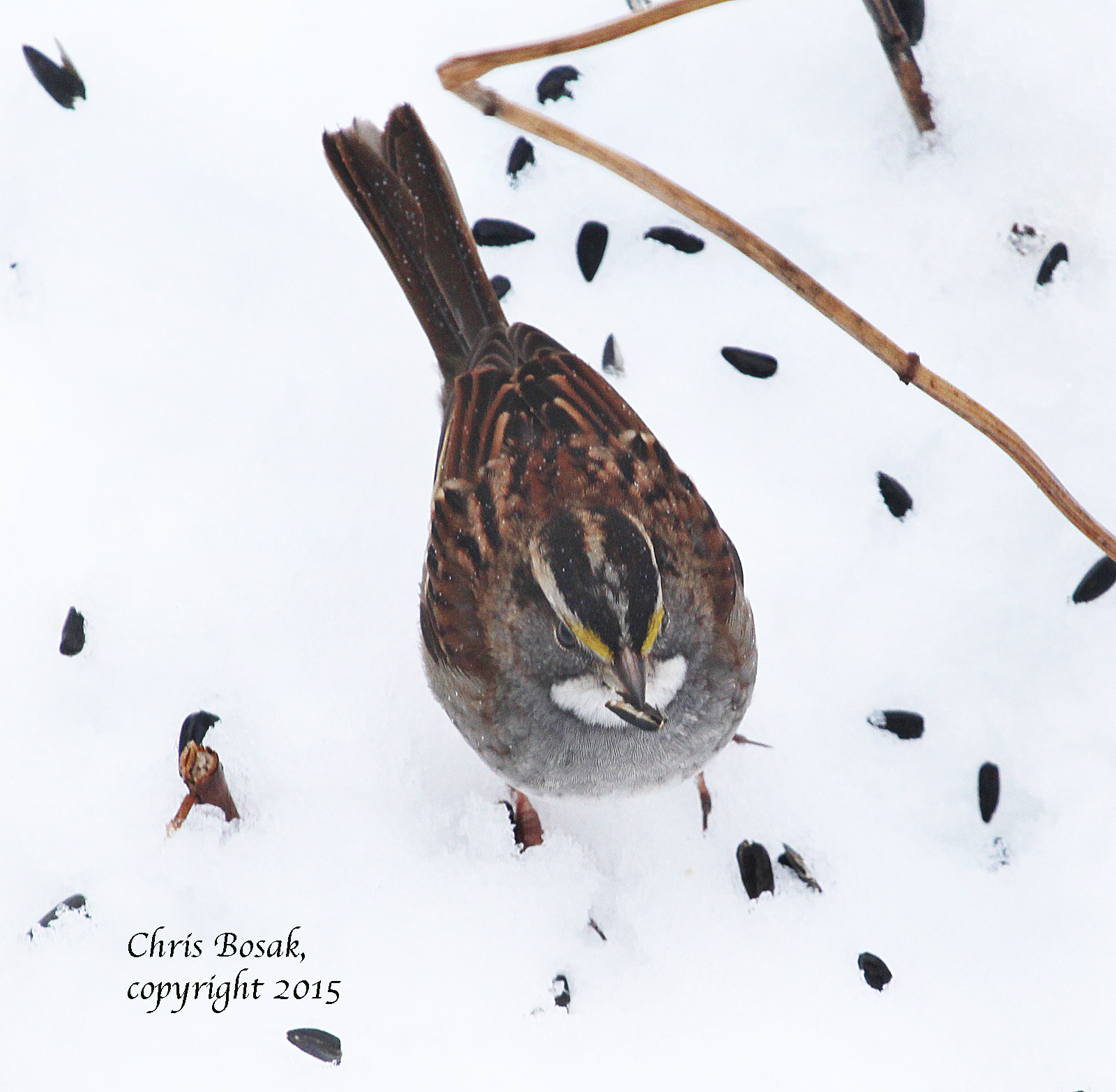 I didn’t do so well in that department as the birds were surprisingly somewhat scarce. White-throated Sparrows were the most plentiful species, with 10 to 12 under the feeders at all times. A Downy Woodpecker showed up frequently, too. There were infrequent visits from cardinals, juncos and titmice. That’s about it. The Carolina Wren didn’t show up, no other woodpeckers showed up, no Blue Jays and no nuthatches or chickadees. Not sure why some of those usually reliable species didn’t show up. Sometimes that just happens. I don’t think it reflects some broader decline in those species, it just means they were elsewhere on that particular day. Oh well, I’ll get them next time.