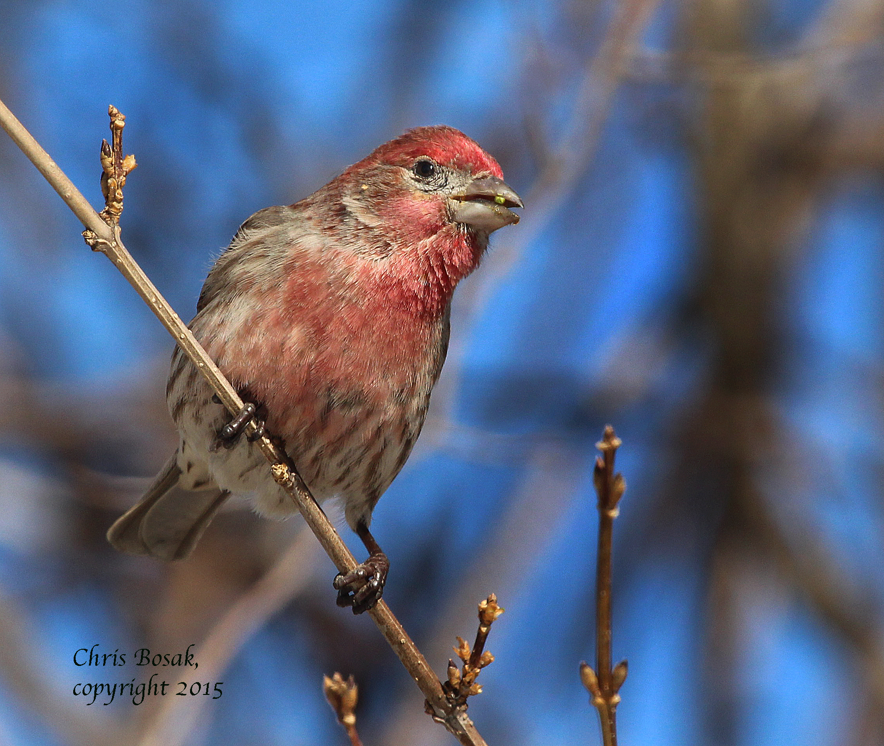 Photo by Chris Bosak A House Finch eats buds from a bush in Norwalk, Conn., Feb. 2015.