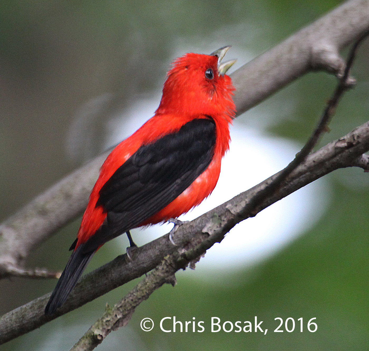 Photo by Chris Bosak A Scarlet Tanager perches in a tree in Danbury, Conn., July 2016.