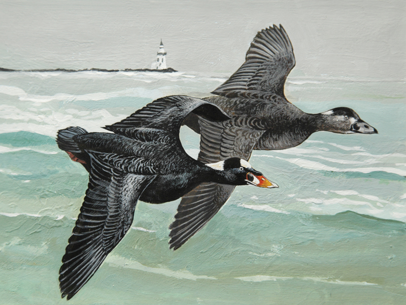 In a contest filled with great artwork, a panel of judges recently selected world renowned and Connecticut artist Chet Reneson’s depiction of a pair of surf scoters flying at the mouth of the Connecticut River with the Saybrook Jetty and Lighthouse in the background as the winner of the Department of Energy and Environmental Protection’s (DEEP) 2017-2018 Connecticut Migratory Bird Conservation (Duck) Stamp Art Contest. Chet has been painting and carving for over half a century and resides in Lyme. His painting was chosen out of a total of 22 entries submitted by artists from across the country, including a record 12 from Connecticut artists.