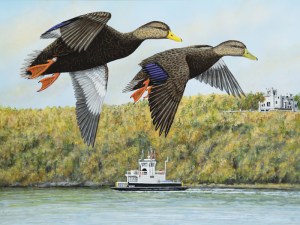 Paintings were judged in six categories: suitability for reproduction, composition, habitat suitability for that species, anatomical correctness, eye appeal, originality, and whether a recognizable Connecticut landmark or habitat was used. Chet’s painting will be the image for the 2018 Connecticut Duck Stamp. A pair of American black ducks flying in front of Gillette Castle and the Chester Ferry painted by Broderick Crawford of Georgia placed second. Broderick’s artwork has placed third twice and this was the second time his work has been runner-up. Third place went to the Clayton Family of Ohio for a painting of a pair of Canada geese painted by Matt Clayton. The Clayton Family has submitted artwork every year, and Christine placed second in 2015 and third in 2016.