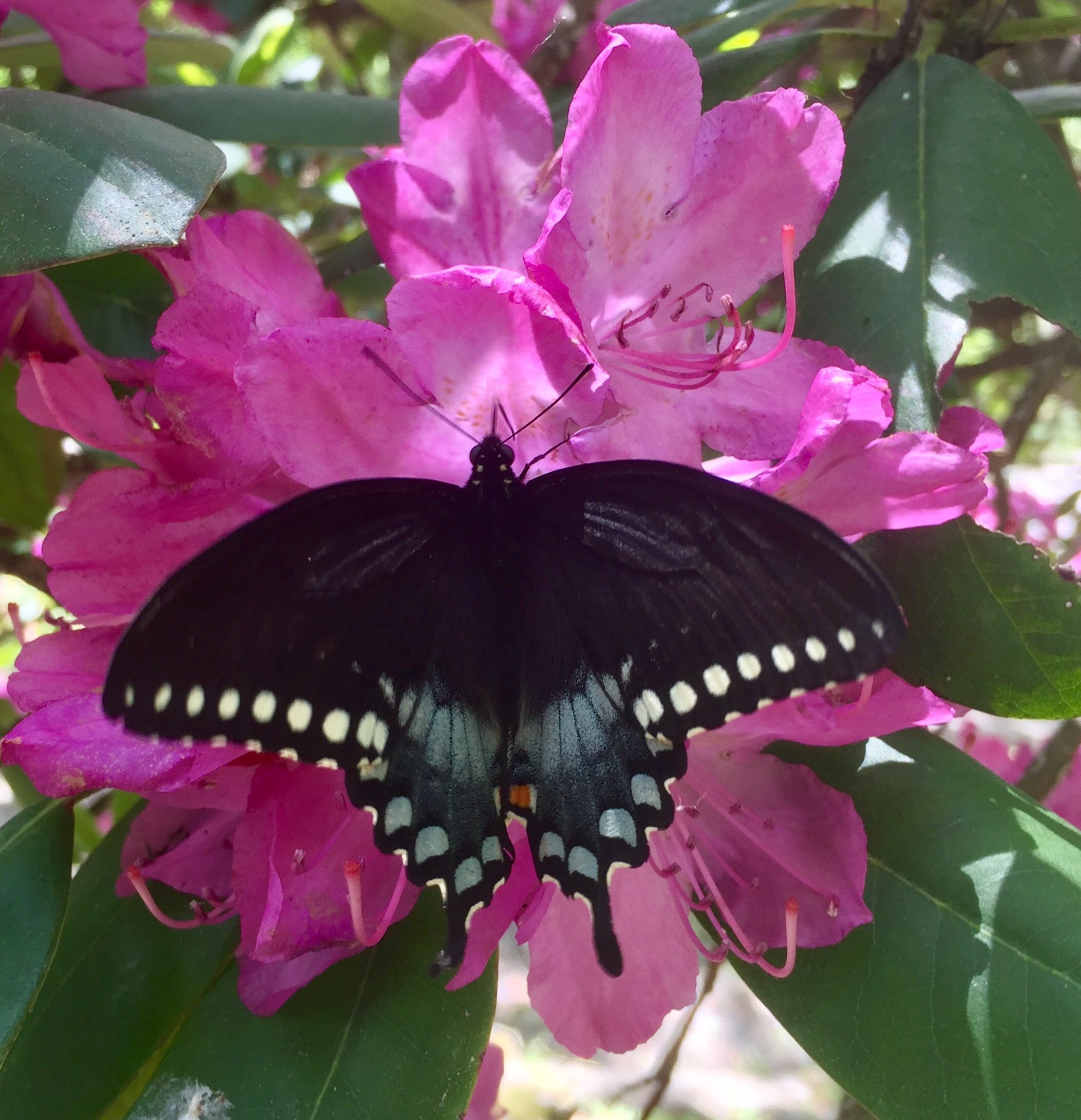 I walked out the front door and this black swallowtail was nice enough to land on the rhododendron right in front of me. The rhododendron, by the way, is awesome in bloom for about three weeks each late spring. Only better when a nice butterfly stops to check it out. I didn’t have my “real” camera with me so I did the best I could with my iPhone.