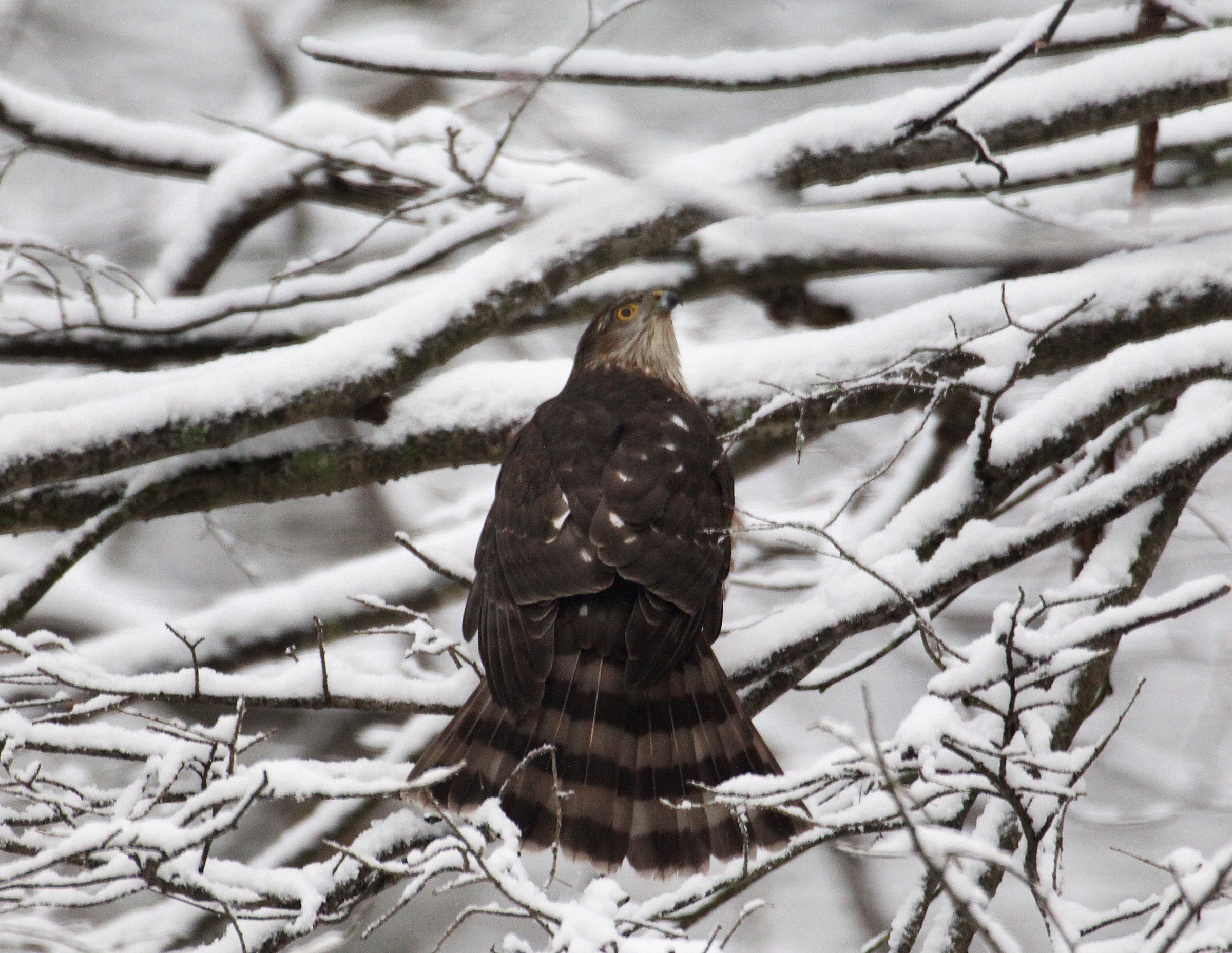 A Cooper’s hawk looks up after landing on a snowy branch during a moderate snowfall in Jan. 2018.
