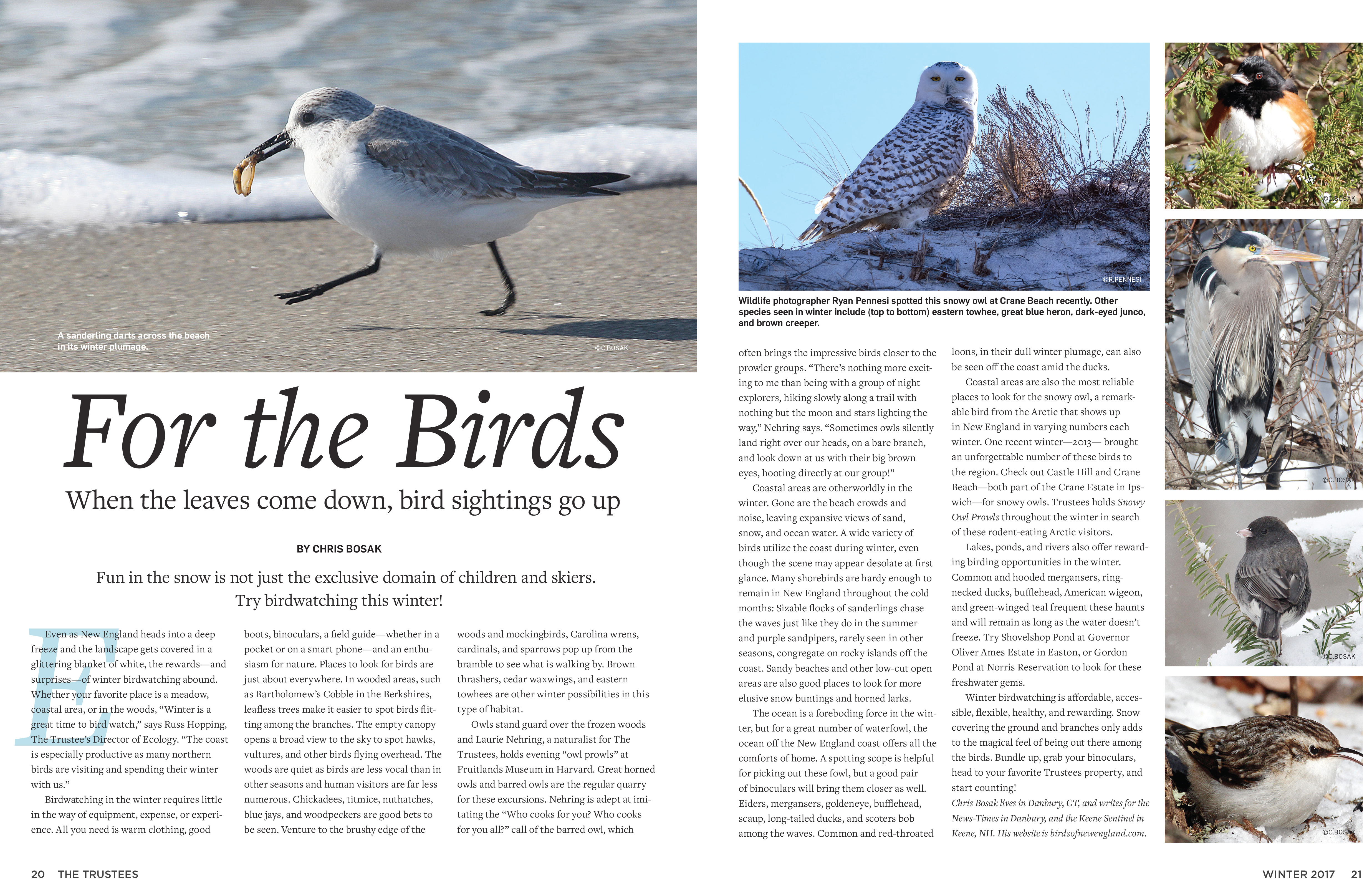 Kudos to the layout team at Special Places, the magazine of the The Trustees of Reservations, a Massachusetts conservation organization with many terrific lands under its care. I was asked to write a story on winter birdwatching, which of course I accepted. The editorial and layout team did a great job of packaging the story and making the story look great. (All of the photos are mine, too, except for the nice shot of the snowy owl, which was taken by Ryan Pennesi.)