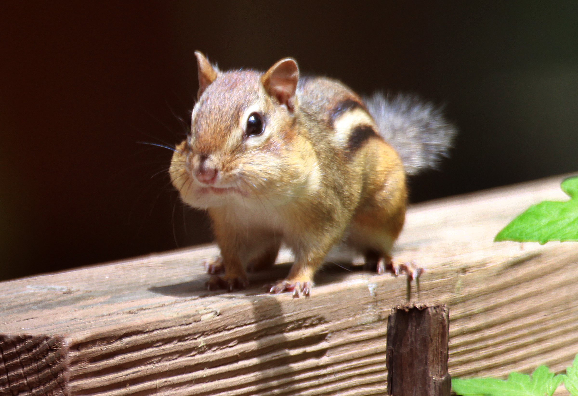 I scratched my head, turned around and walked back inside. I returned to my makeshift office in my son’s room to get back to work. As I wrote one thing or another, I glanced out at the feeder and saw a head pop up from behind the tomato plant that obstructs part of the feeder. Aha, that’s the culprit: a chipmunk. It dropped its head back down and a minute later ran across the railing of the deck with a mouthful of seeds.