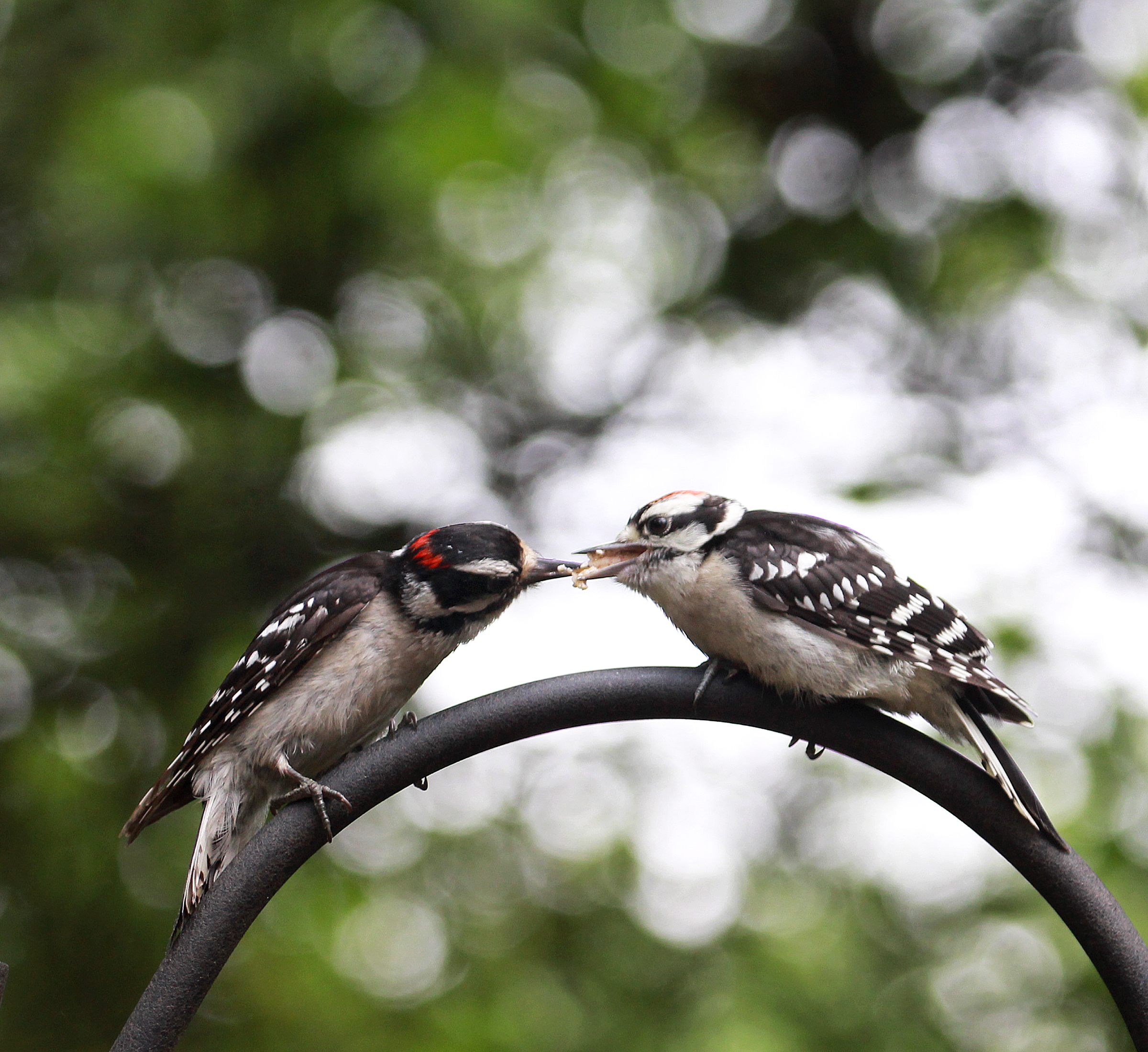 An adult male downy woodpecker, left, feeds an immature male downy woodpecker near a birdfeeder in New England, summer 2018.