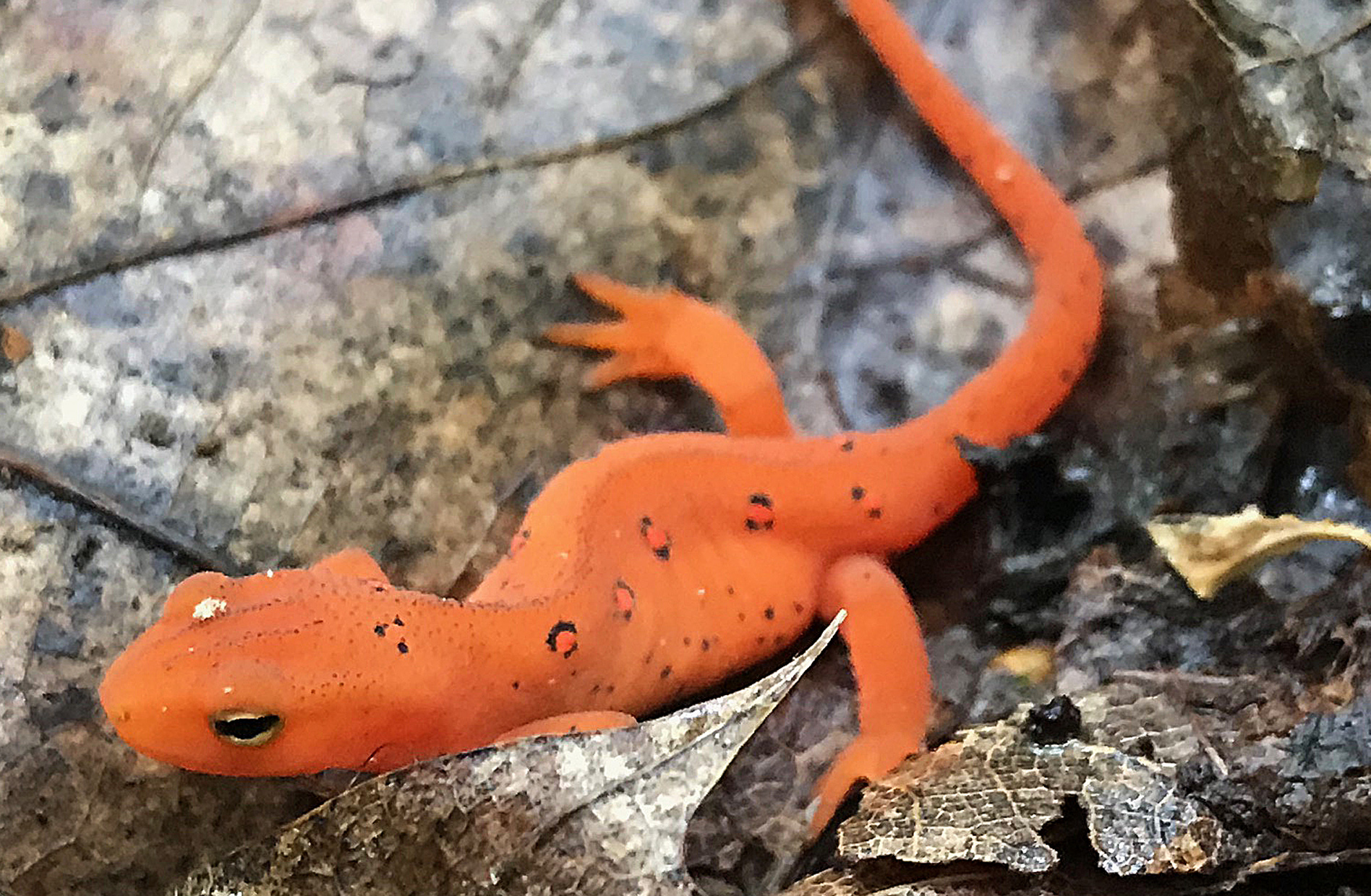 An eft works its way through the woods in Danbury, Conn., during the summer of 2018.