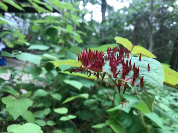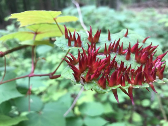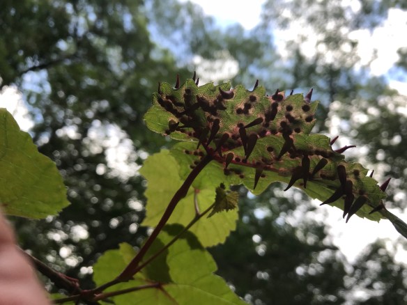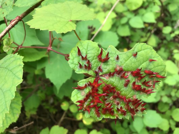 The vine may be a wild grape, but I’m not positive. It is the only such vine growing among the wineberry, so far as I can tell. The leaf appears to have red double-sided daggers sticking out the top and bottom. Perhaps it is a growth coming from either direction. I have no idea. It is the only leaf that looks like this. Of the thousands of leaves surrounding it, this is the only one with this phenomenon.