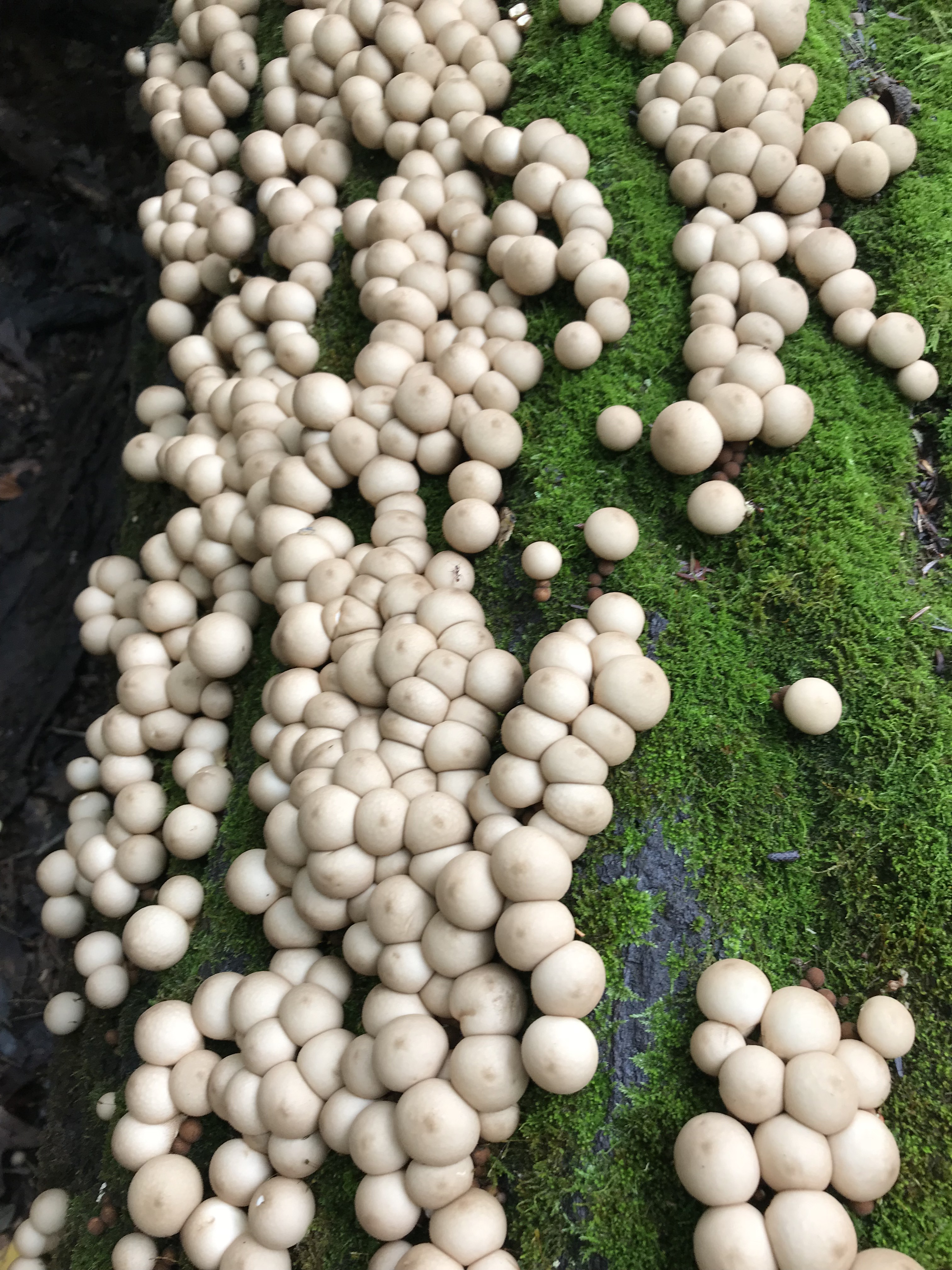 The ones in the above photo are called puffballs. They are 1000% edible if they are PURE white & marshmallowey inside. Once they start to turn yellowish, they are starting to spore out and are no longer edible. I LOVE these cooked in a bit of butter til brown & crunchy. Almost tastes like popcorn to me!