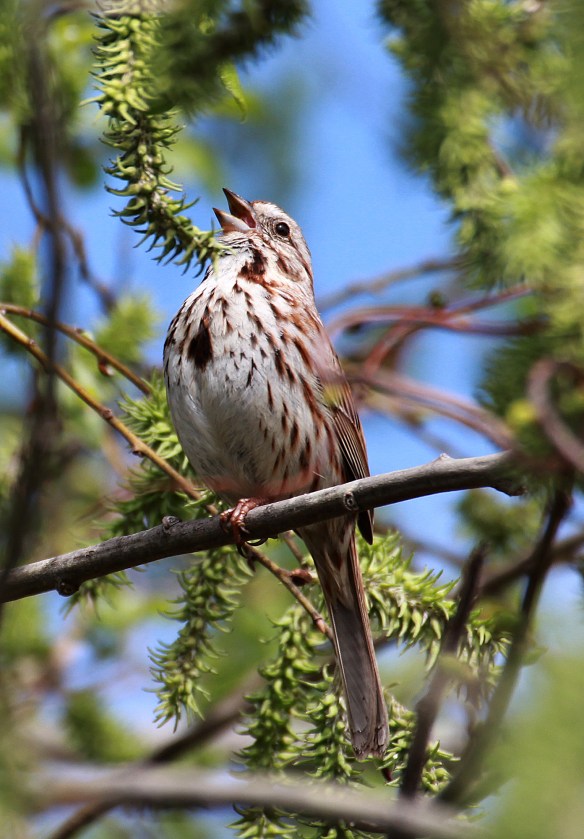 A song sparrow sings from a perch in Brookfield, CT, May 2019.