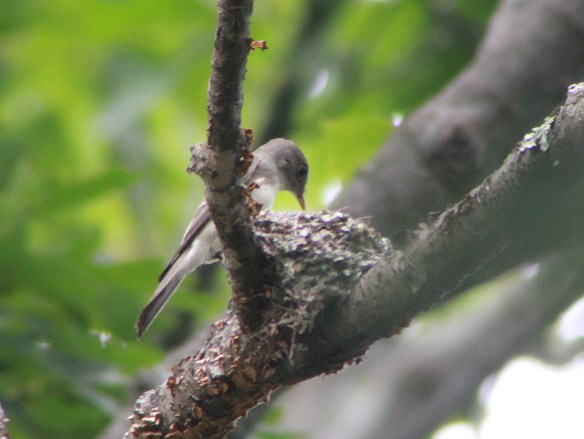An eastern wood-pewee sits on a nest in New England, summer 2019. The small orange thing at the edge of the nest is a newborn pewee.