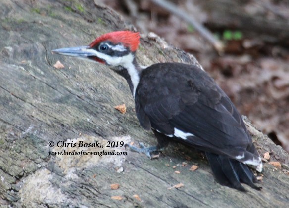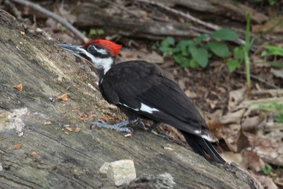 A young pileated woodpecker knocks on a fallen tree trunk as it looks for insects, Danbury, Conn., summer 2019.