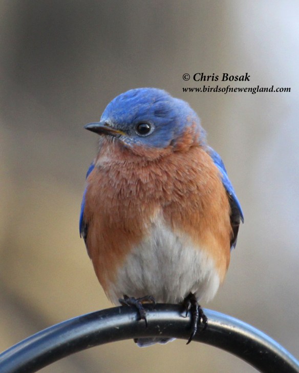 Photo by Chris Bosak An eastern bluebird perches on a pole in New England, February 2020.