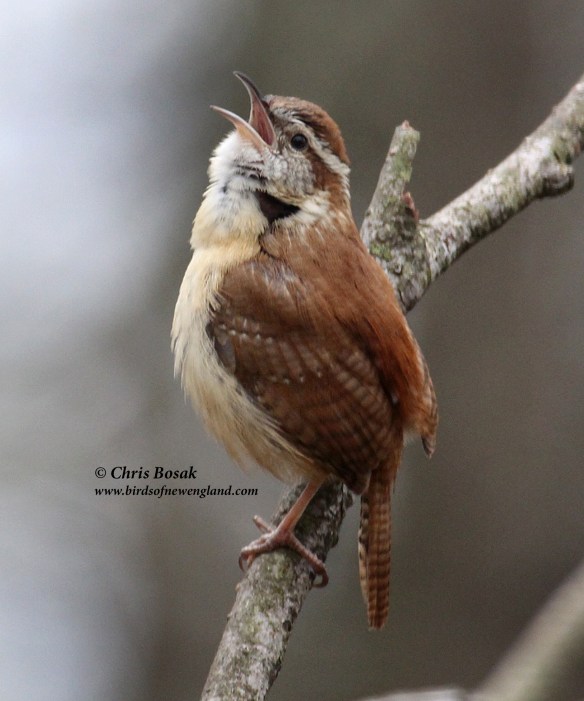 A Carolina wren sings on a branch this spring in New England.
