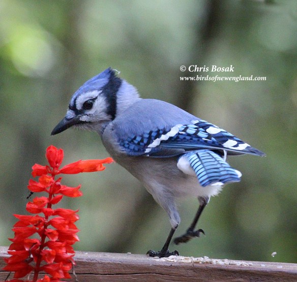 Photo by Chris Bosak A blue jay eats sunflower seeds near salvia blooms in New England, September 2020.