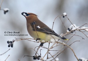 I got my fill of photos and then did a quick scan for any random Bohemian waxwings that may have been mixed in with the flock. Bohemian waxwings on rare occasions can be seen in New England with cedar waxwings. I have yet to see one, but I have read several reports of that happening. Bohemian waxwings are a larger cousin of the cedar waxwing.