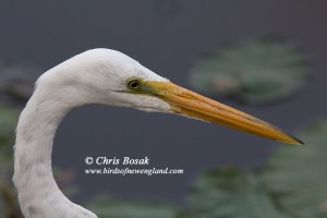 A great egret at an inland pond in New England is certainly not something to post on any rare bird alert, but it was nice to see the tall wader just the same. Great egrets are more commonly found in the region along the coast or around brackish waters. Just like a black-crowned night heron sighting, I always find it interesting to find a great egret on a freshwater pond. Finding a snowy egret, the great egret’s smaller cousin, on a freshwater pond would be a much rarer occurrence as they generally stick to the coast.
