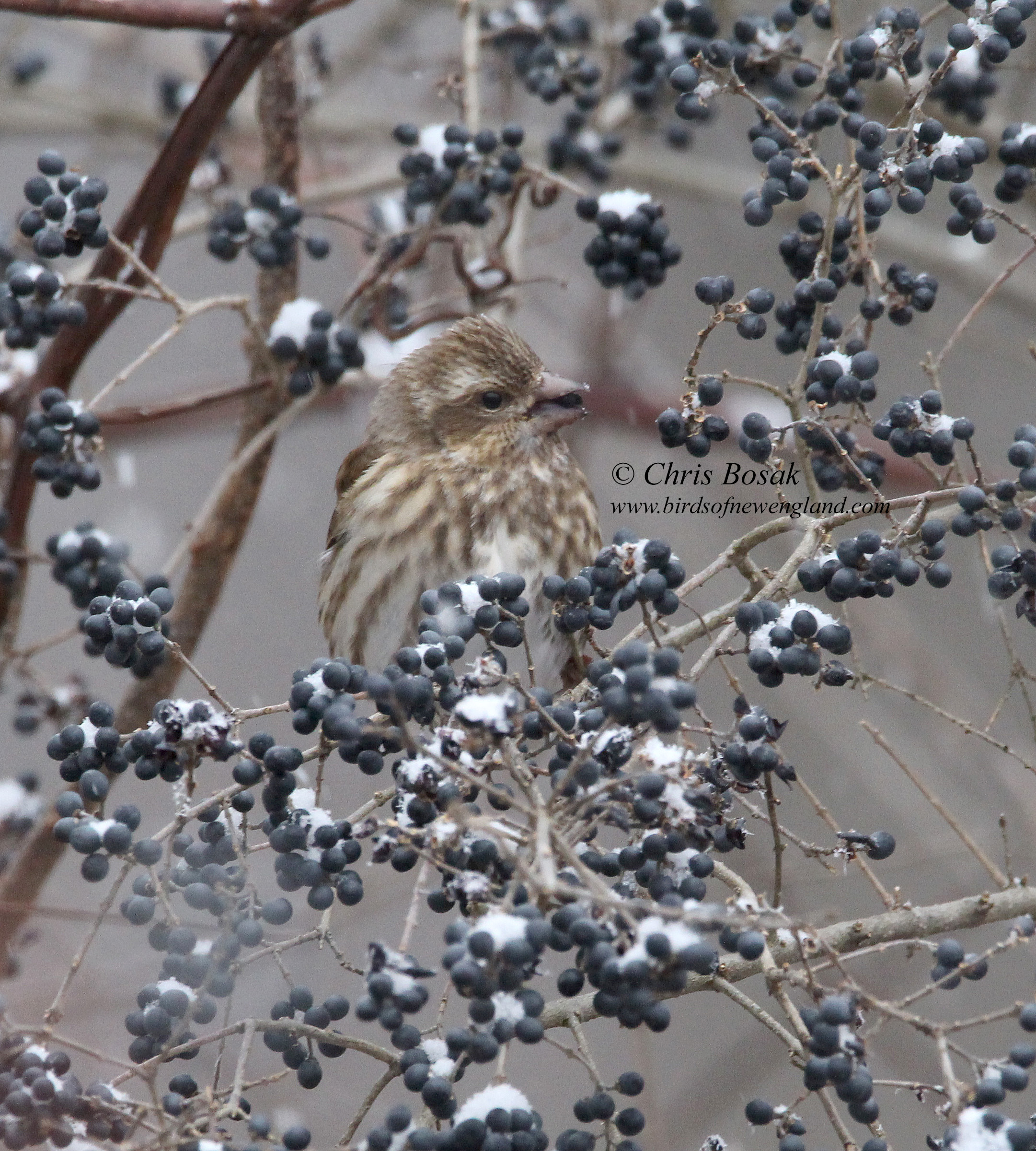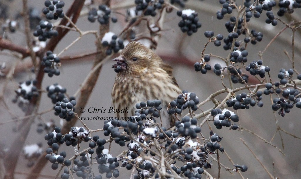 As promised, here are a few photos of the female purple finch, as seen and photographed in Connecticut during Tuesday’s snowfall. She is eating berries from a silky dogwood, I believe. Females lack the bright colors of the male but are spectacularly designed. They are slightly larger and more decorated than female house finches.