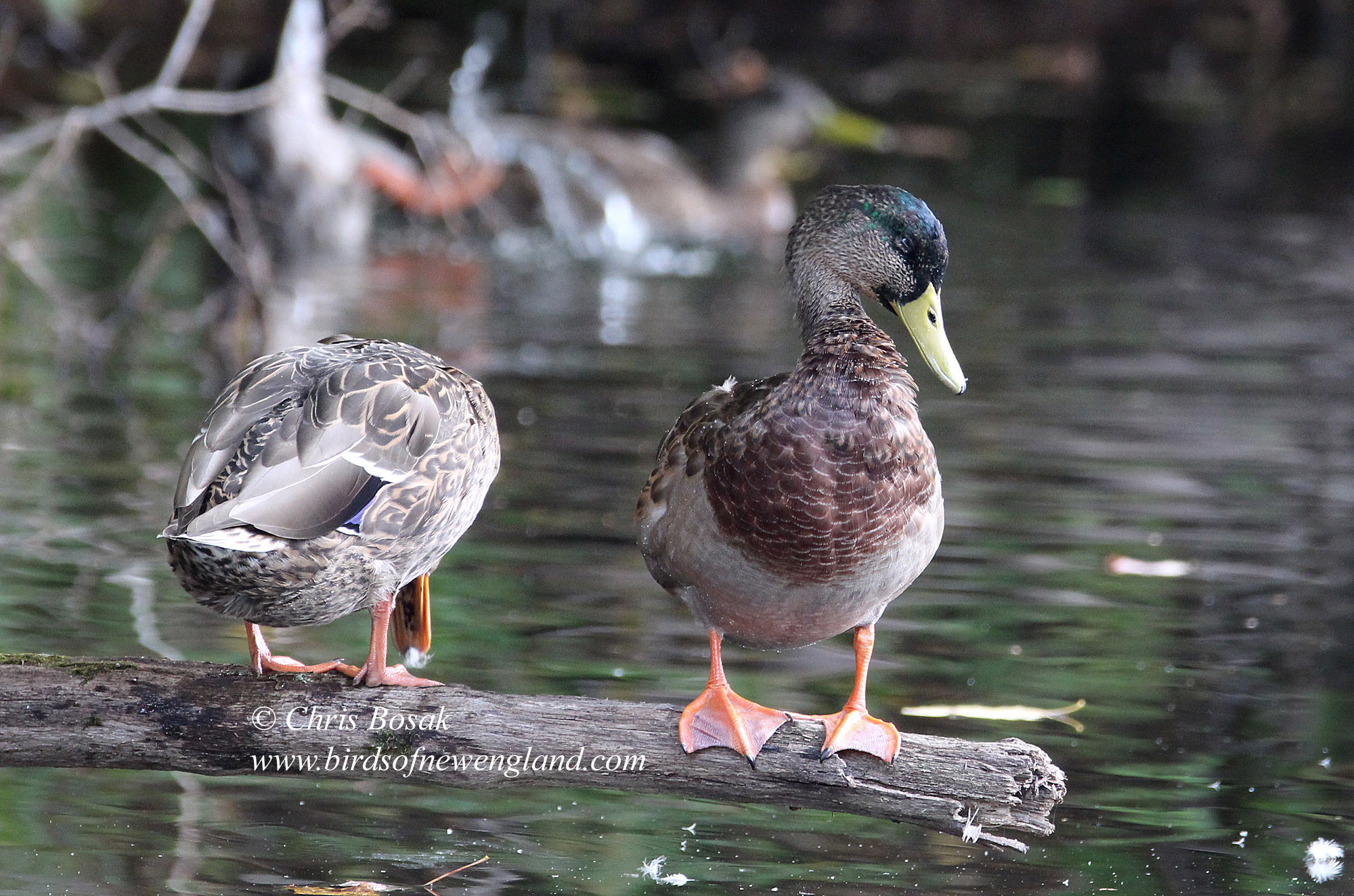 Photo by Chris Bosak – Mallards sit on a log in New England, fall 2024. The mallard on the right is a young male.