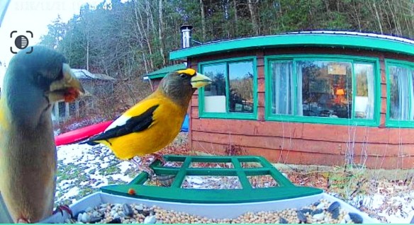 Although I haven’t seen any yet this year (of course), I have received several reports of people seeing evening grosbeaks at their feeders. Mike Quinn, an old friend I’ve known since the mid-1970s, sent me a text recently asking if I could identify a bird that was at his feeder. Naturally, it was a pair of evening grosbeaks. Mike lives in Ticonderoga, N.Y., near the Vermont border. His feeder cam photo accompanies this column.