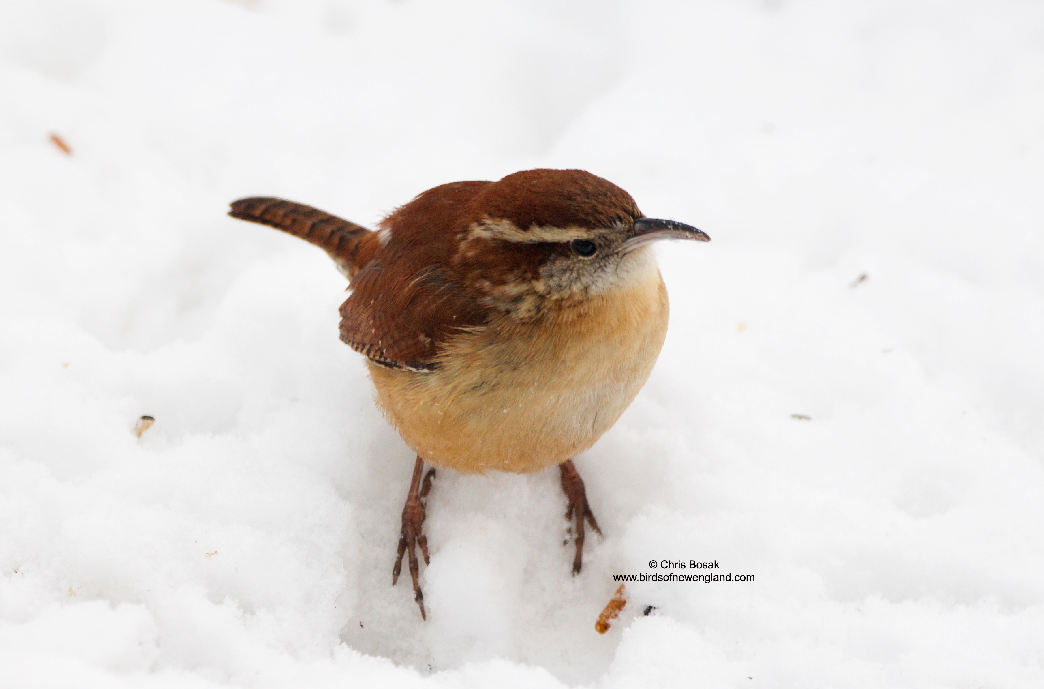 A Carolina wren searches for food under a feeder in New England, January 2026.