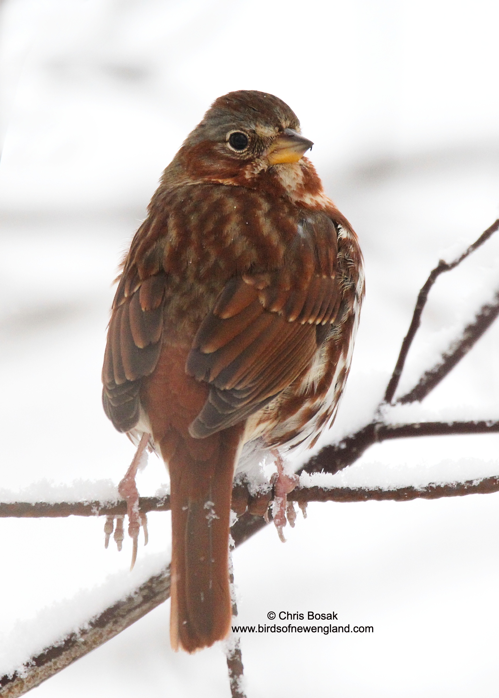 A fox sparrow perches on a snowy branch in New England, January 2026.