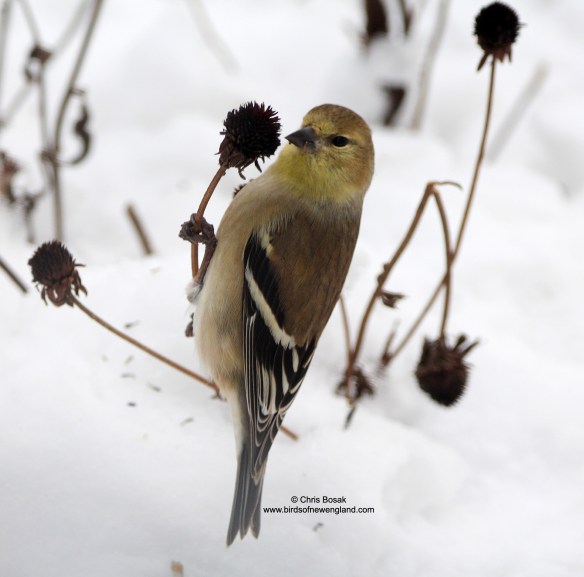 American goldfinch eats seeds from a spent flower in New England, January 2026.
