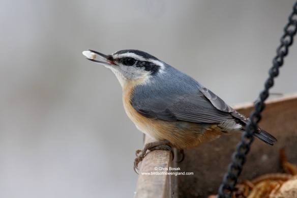 A red-breasted nuthatch takes a safflower seed from a feeder in New England, January 2026.