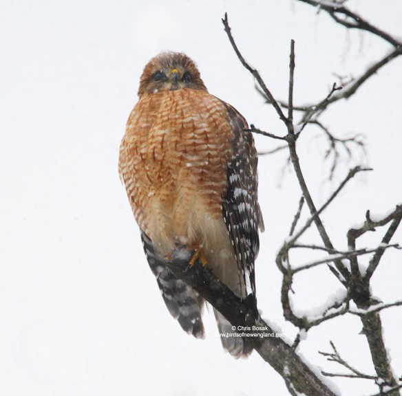 A red-shouldered hawk perches on a branch during a snowy day in New England, January 2026.