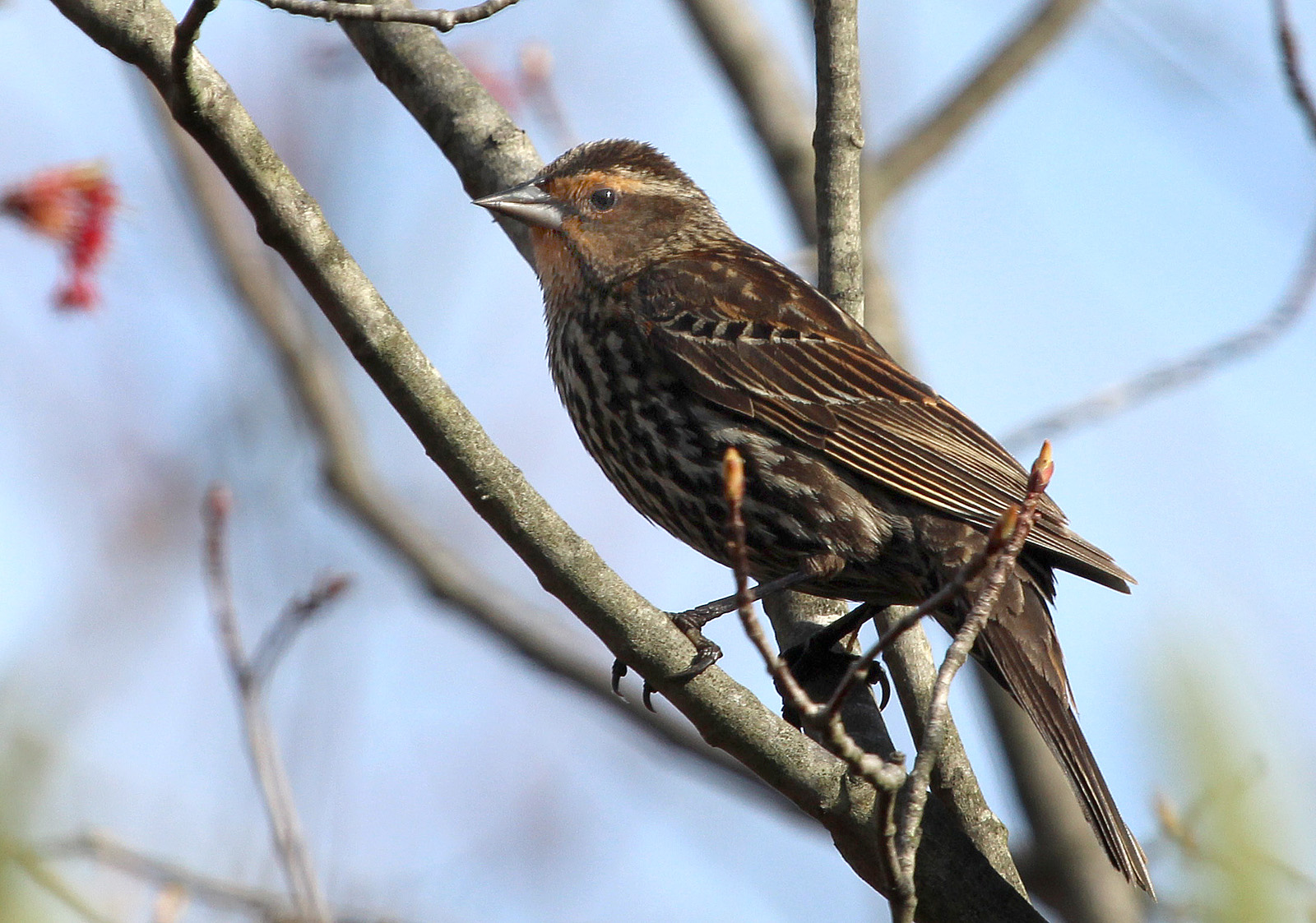 Typically, males arrive a few weeks ahead of the females, but this flock had good numbers of male and female red-winged blackbirds. Female red-winged blackbirds somewhat resemble large, dark, streaked sparrows with a yellow wash around a longer, pointed bill. The flock also included a number of nonbreeding birds.