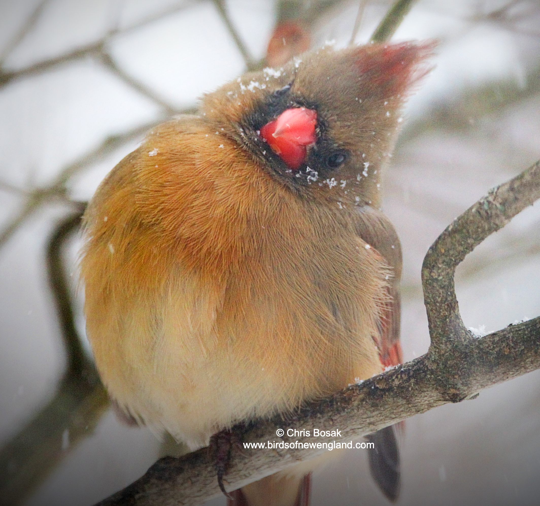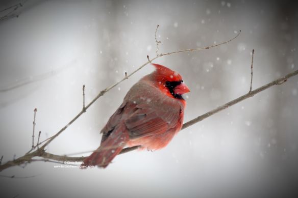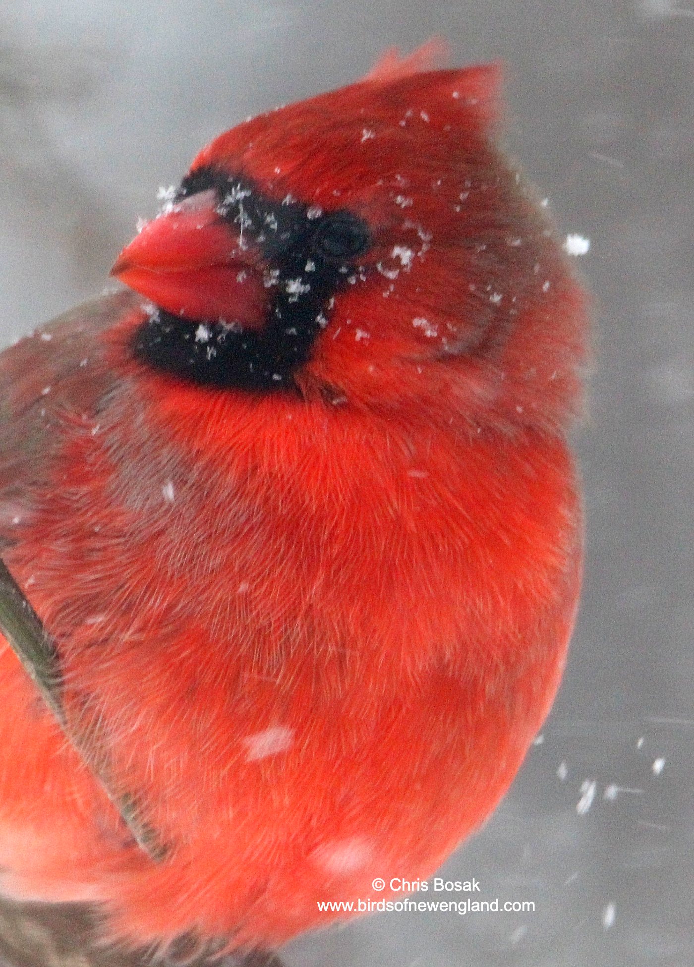 A male cardinal perches on a branch during a snowstorm, January 2026, New England.