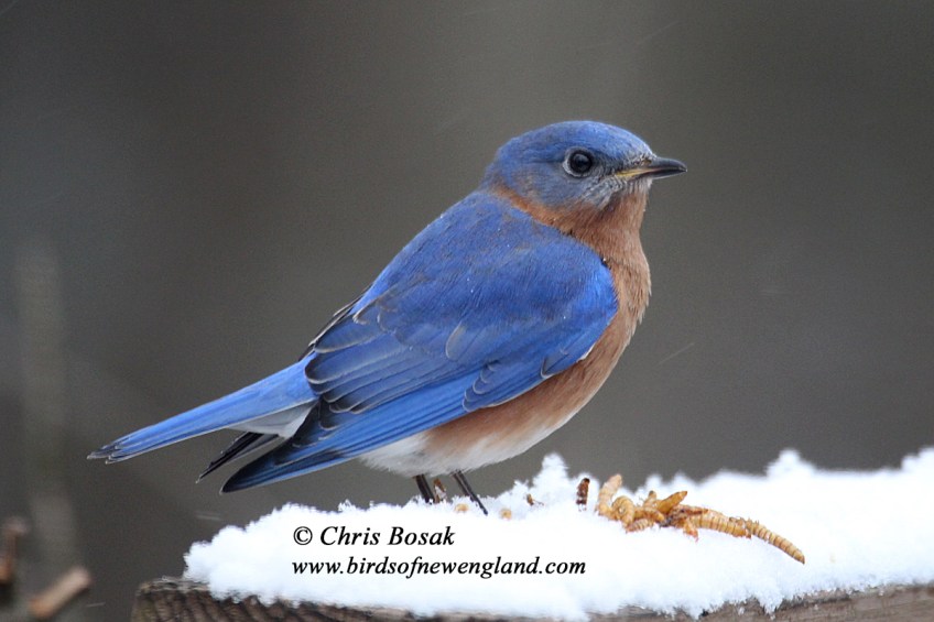 bluebird snow6c Published February 14, 2021 at 1200 × 800 in bluebird snow6c Photo by Chris Bosak An eastern bluebird braves a New England winter and visit a backyard for mealworms, winter 2020.