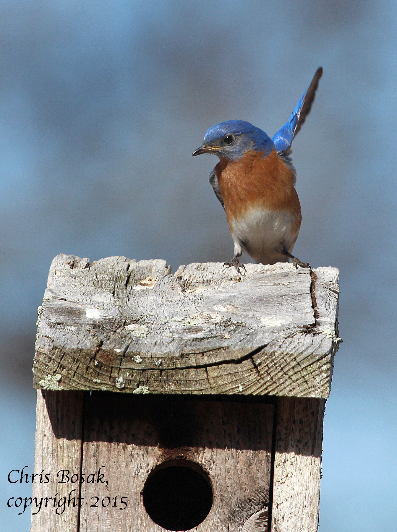 Photo by Chris Bosak An Eastern Bluebird stretches a wing as it rests on a birdhouse at Mather Meadows in Darien, Conn., April 2015.