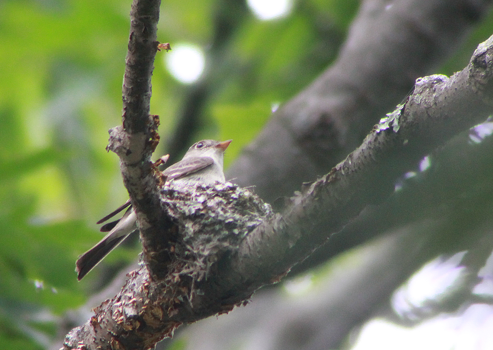 No, I didn’t find a scarlet tanager. I did, however, find the active nest of an eastern wood-pewee. Somehow, my binoculars trained themselves right on the spot. The small, cupped nest is built in the Y of a dead branch sticking out among the impenetrable foliage, about 40 feet high.