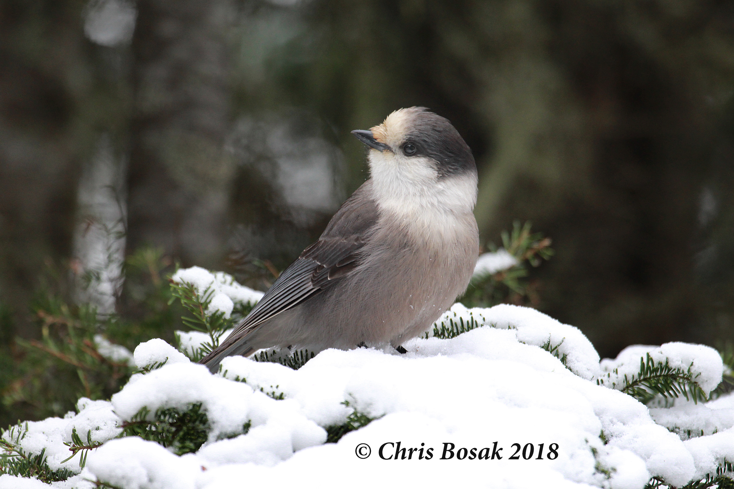 Gray jay on snowy bough in Pittsburg, N.H., Nov. 2018.