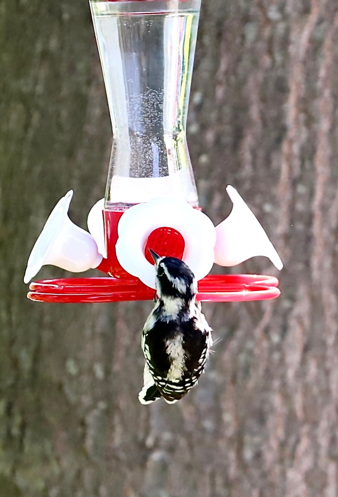 Photo by Brian Thoele – Brian Thoele of Norwalk, Conn., got this shot of a downy woodpecker on a hummingbird feeder.