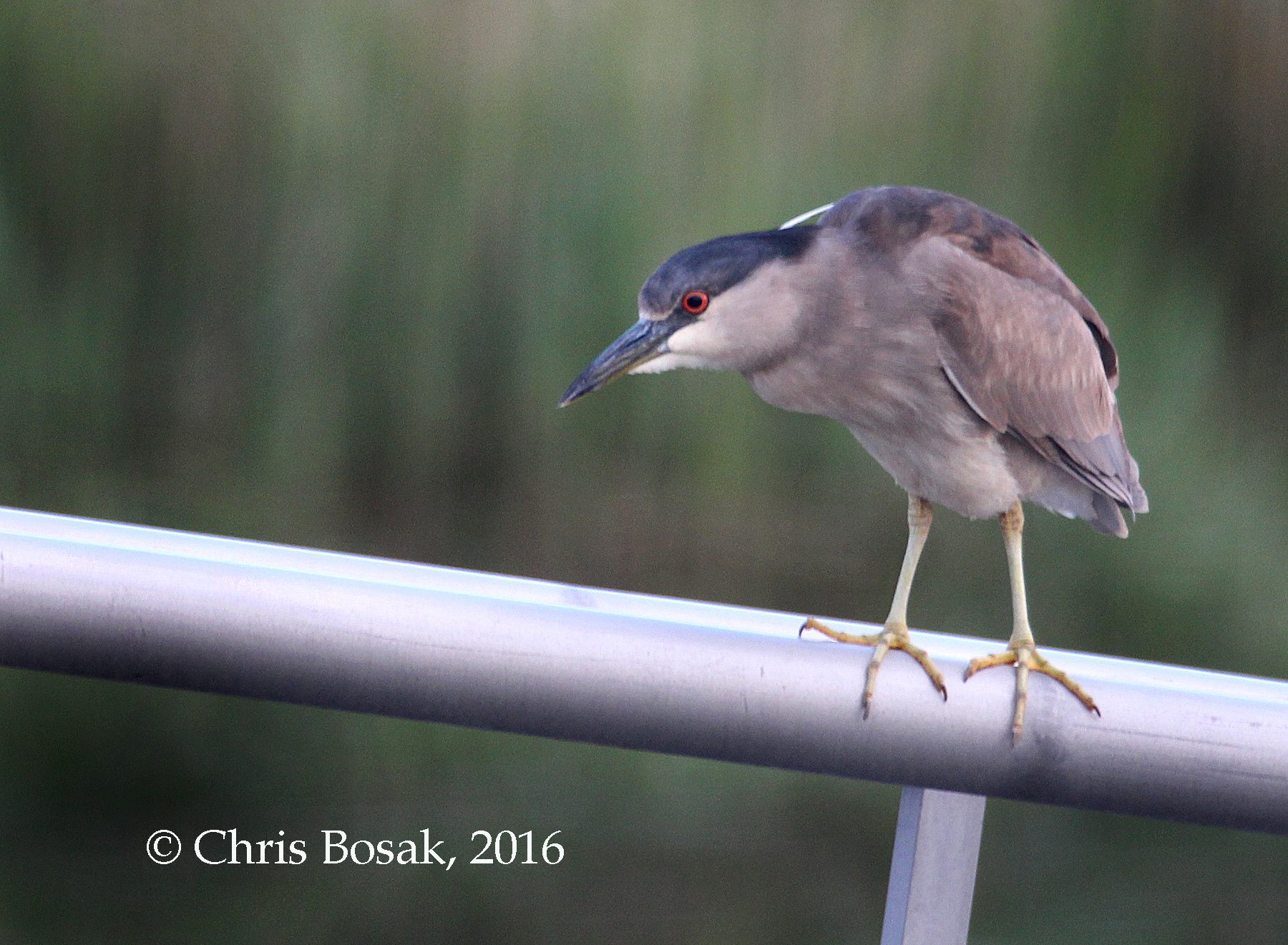 Photo by Chris Bosak A Black-crowned Night Heron perches on a railing at a marina along the Norwalk River, Norwalk, Conn., spring 2016.