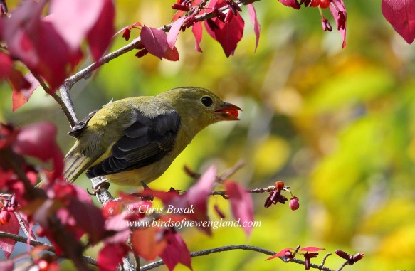 A male scarlet tanager in fall plumage eats berries in New England, fall 2024.