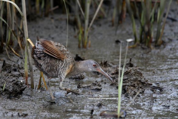 Rails are shy birds of the marshlands. Clapper rails are usually heard before they are seen, if they are seen at all. I stood in the muck at low tide for several minutes, and finally, this clapper rail decided to come out of the vegetation and walk along the mud for a few seconds. Several rails were calling back and forth in the marsh.