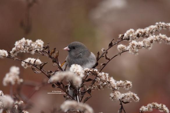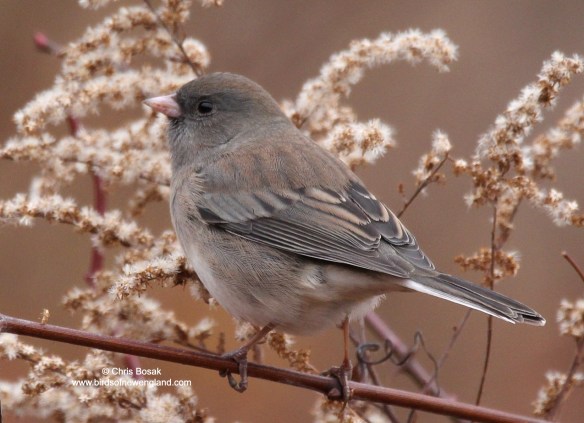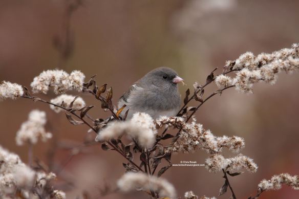 Photo by Chris Bosak – A dark-eyed junco eats goldenrod seeds at Huntington State Park in Redding, Connecticut, November 2025.