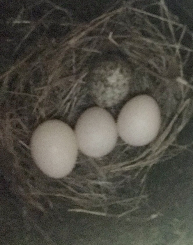 The first egg was laid on Tuesday, June 11. On Wednesday, another phoebe egg and the cowbird egg was discovered. Thursday and Friday brought one phoebe egg each for a total of four phoebe eggs and one cowbird egg.