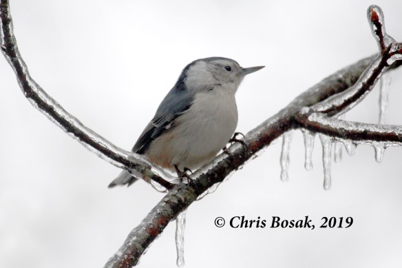 Photo by Chris Bosak A white-breasted nuthatch perches on an icy branch, Danbury, Connecticut, January 2019.