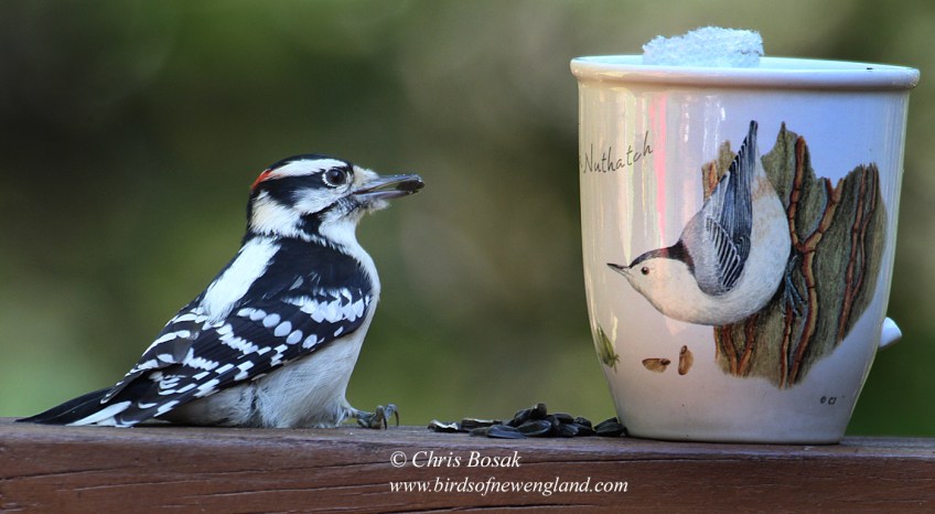 downy-mug1c Published December 9, 2020 at 1400 × 770 in downy-mug1c Photo by Chris Bosak A downy woodpecker grabs a seed and looks at a coffee mug bearing a drawing of a white-breasted nuthatch in New England, fall 2020.