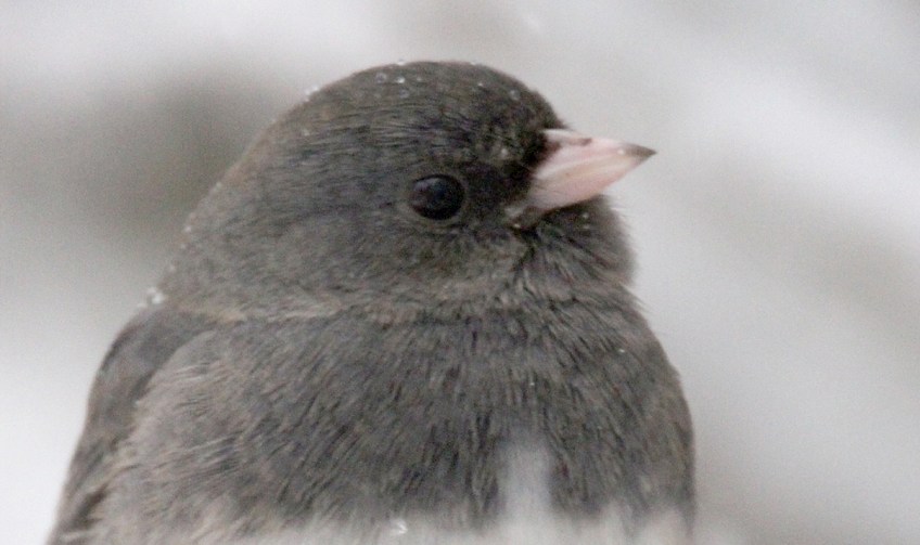 junco-snow3-horiz Published January 27, 2022 at 1205 × 715 in junco-snow3-horiz Photo by Chris Bosak A junco perches on a branch after a snowfall in New England, January 2022.