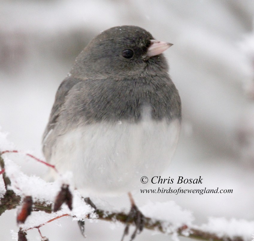 junco snow3c Published January 27, 2022 at 1600 × 1517 in junco snow3c Photo by Chris Bosak A junco perches on a branch after a snowfall in New England, January 2022.