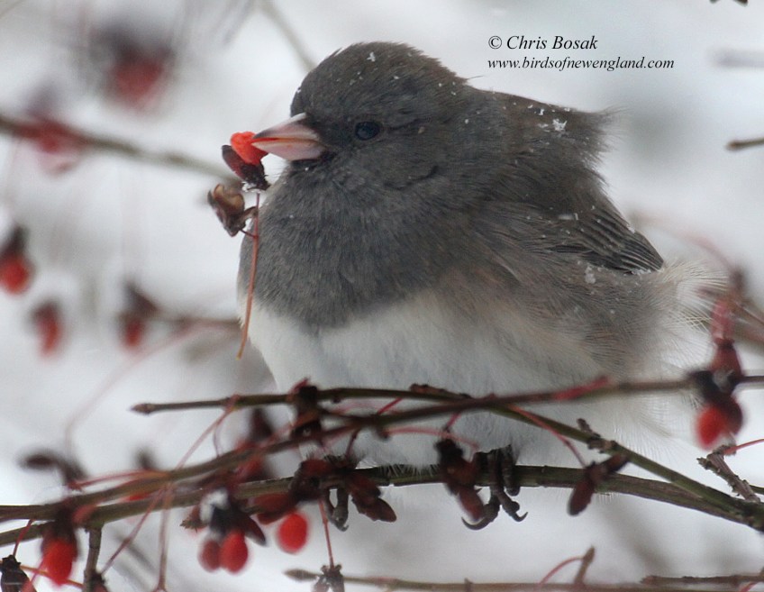 junco3c Published December 17, 2020 at 1600 × 1241 in junco3c Photo by Chris Bosak A dark-eyed junco eats a berry following a snowstorm in New England, December 2020.