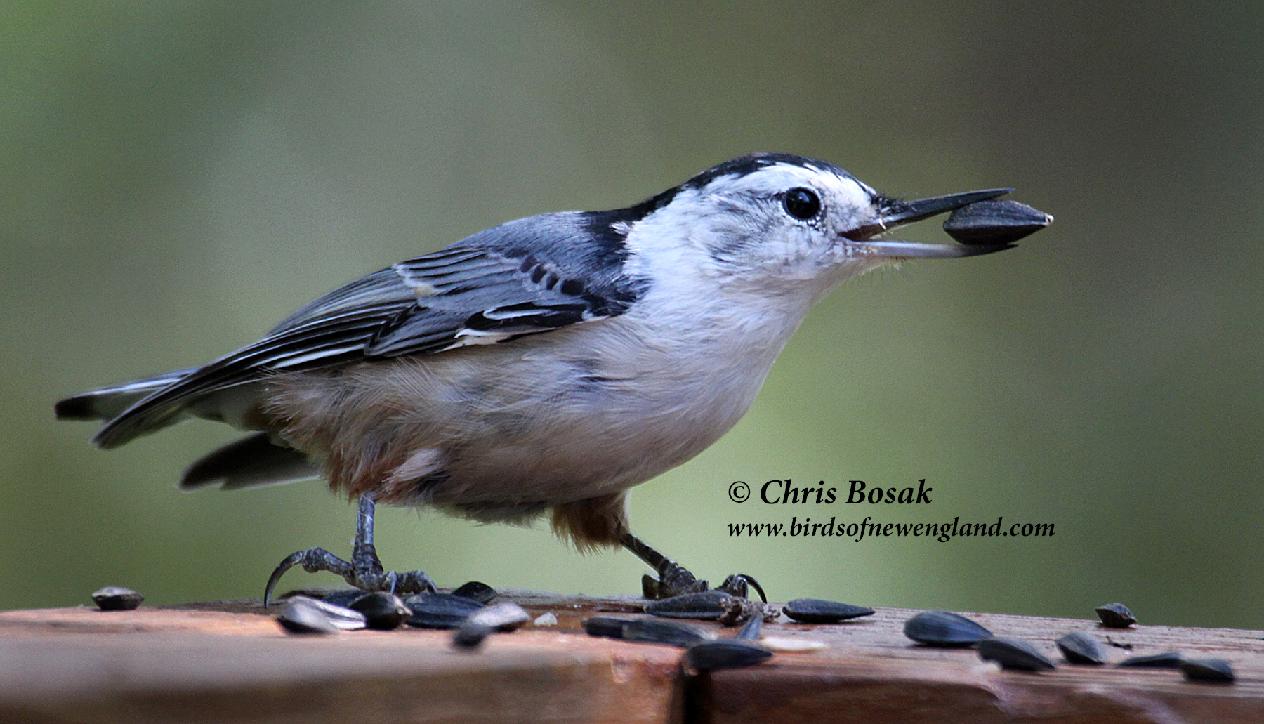 nuthatch1c Published August 20, 2020 at 1800 × 1031 in nuthatch1c Photo by Chris Bosak A white-breasted nuthatch grabs a sunflower seed from a deck railing in New England, August 2020.