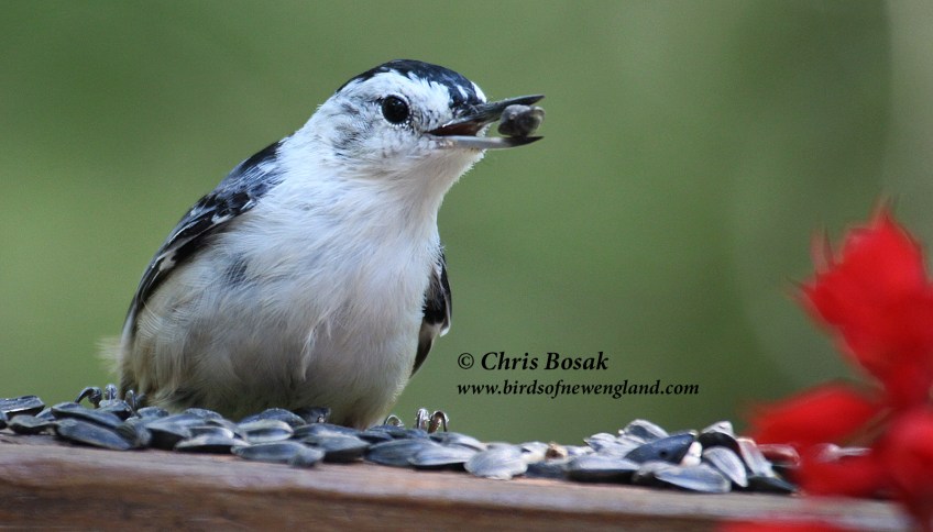 nuthatch2c Published August 20, 2020 at 1800 × 1028 in nuthatch2c Photo by Chris Bosak A white-breasted nuthatch grabs a sunflower seed from a deck railing in New England, August 2020.