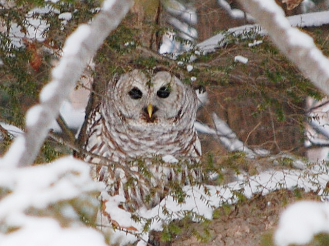 Mary Ellen Powell got this photo of a Barred Owl along Route 9 near Otter Brook State Park, Roxbury, NH, winter 2014-15.